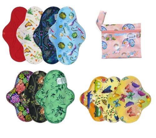 Set of 10 pieces of cloth menstrual pads in different sizes: 4xL, 3xM, 3xS + small waterproof bag